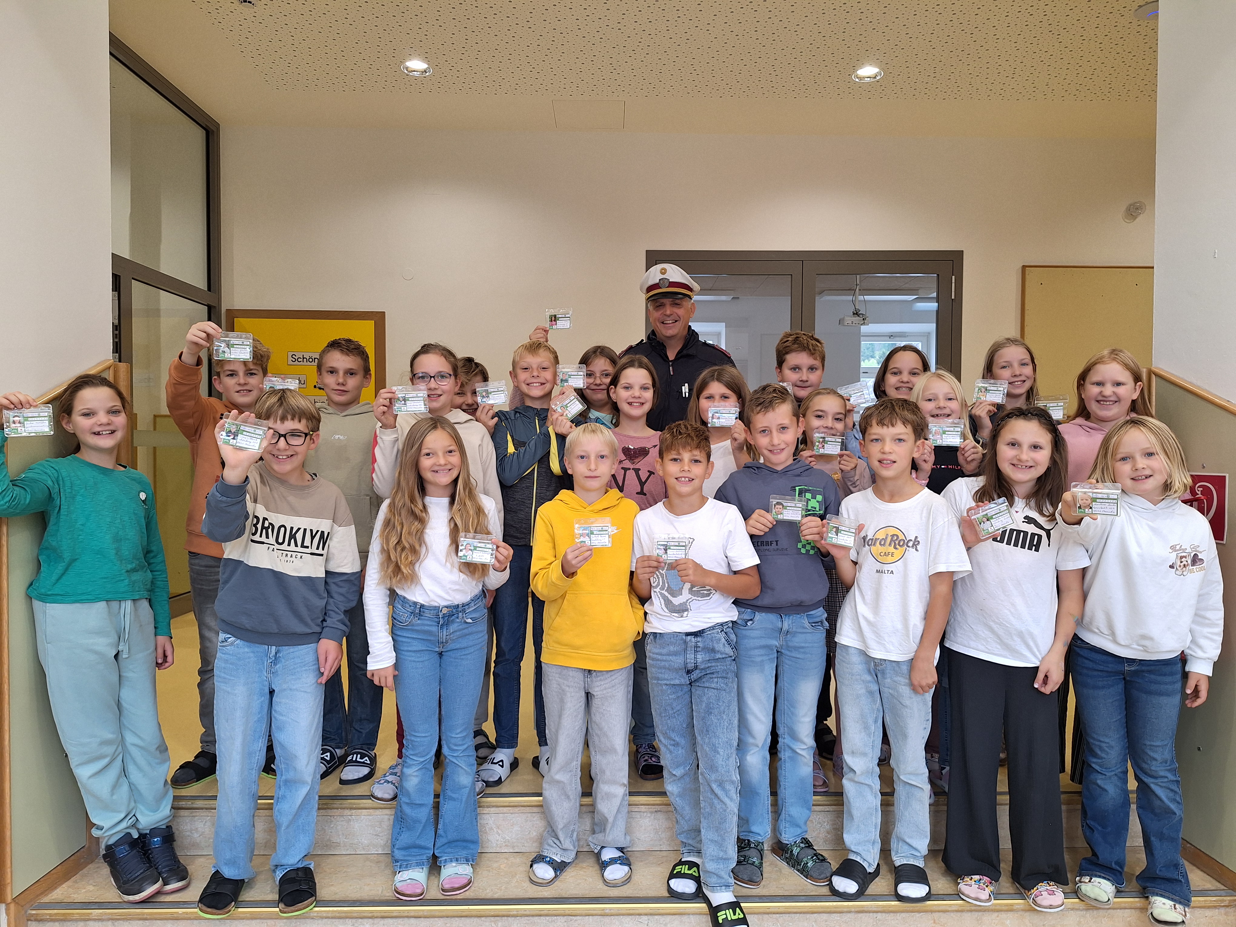 | Viele lachende Gesichter in den 4. Klassen. Im Oktober haben alle Kinder die Radfahrprüfung bestanden und sind nun stolze Besitzer und Besitzerinnen des Radfahrausweises. |