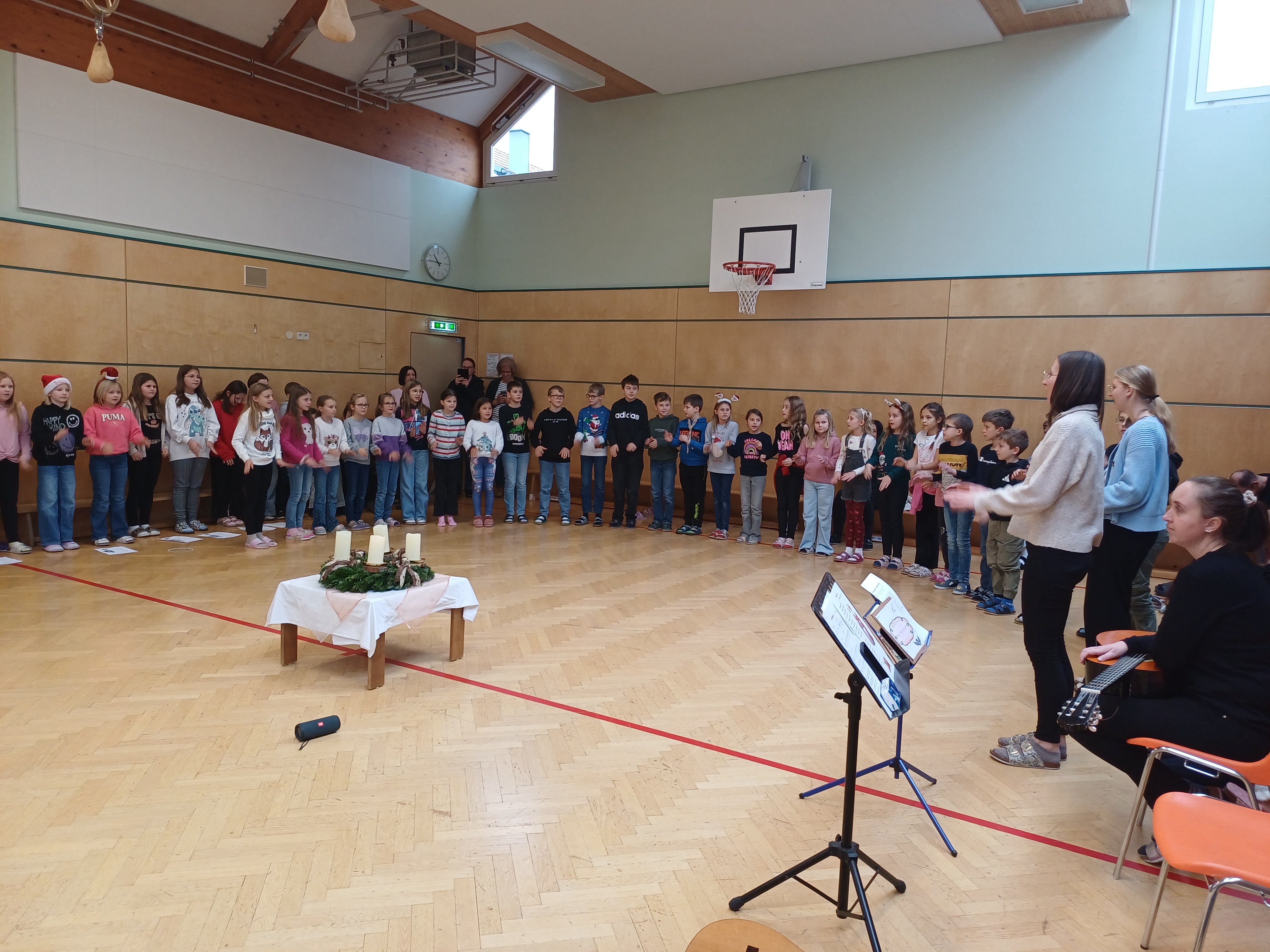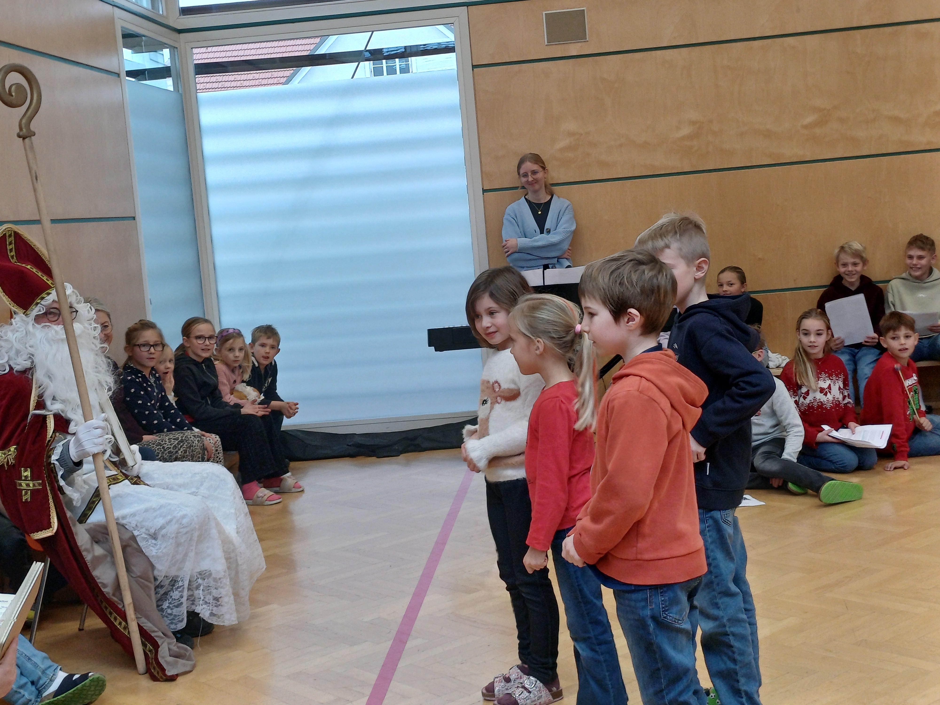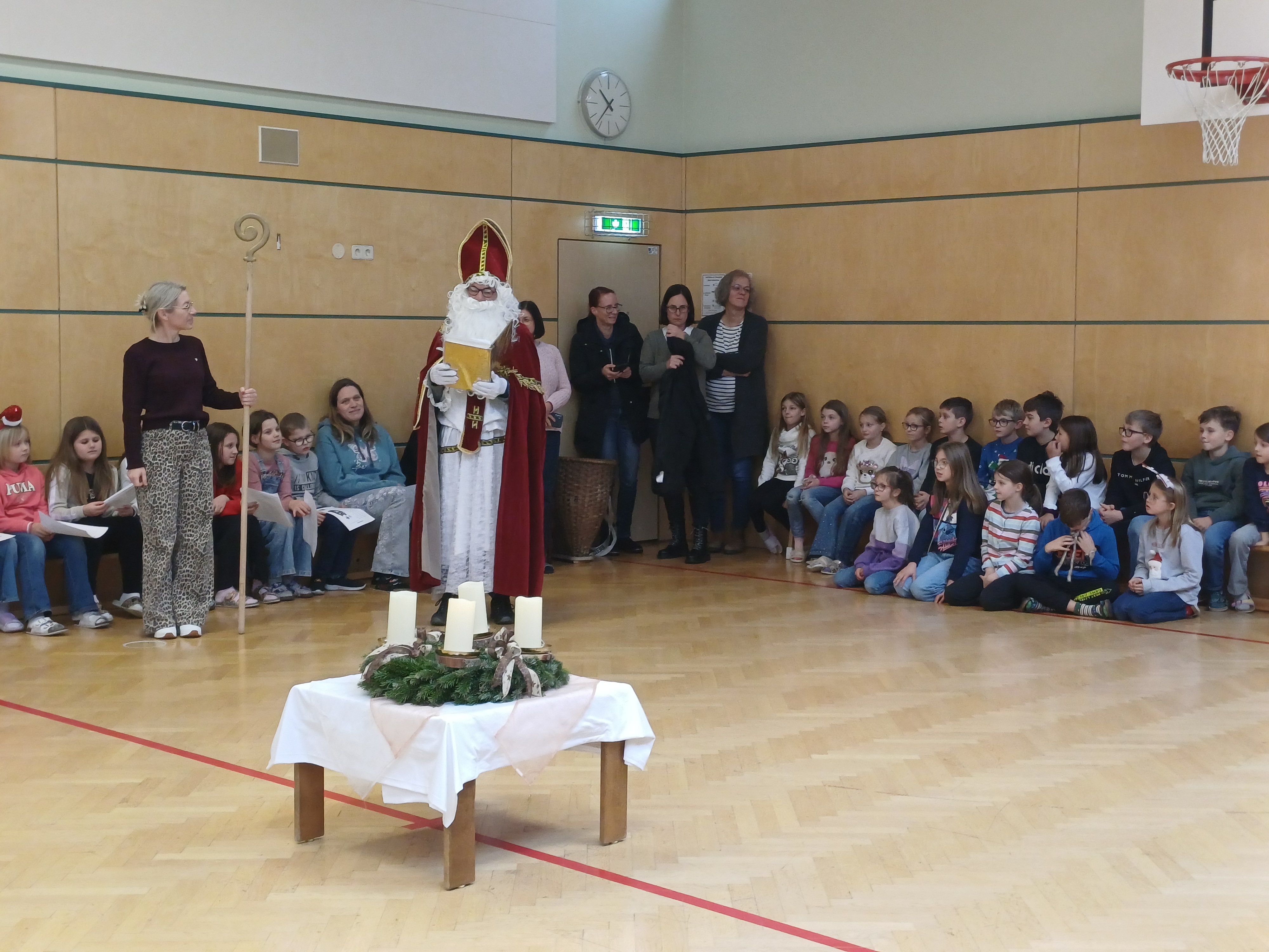 Am 5.12.2025 besuchte der Herr Nikolaus die Kinder der Volksschule Oberwölz. Es fand eine stimmungsvolle Feier im Turnsaal statt. Die Schüler:innen erfreuten ihn mit fröhlichen Liedern und liebevoll vorgetragenen Gedichten. Der Herr Nikolaus lobte die Kinder für ihre Darbietungen und richtete auch liebe Grüße vom Krampus aus. Als Belohnung erhielten alle Kinder und Erwachsenen einen Semmelkrampus - dafür ein herzliches Dankeschön an den Elternverein. Die Nikolausfeier bereitete allen große Freude und sorgte für eine vorweihnachtliche Stimmung.