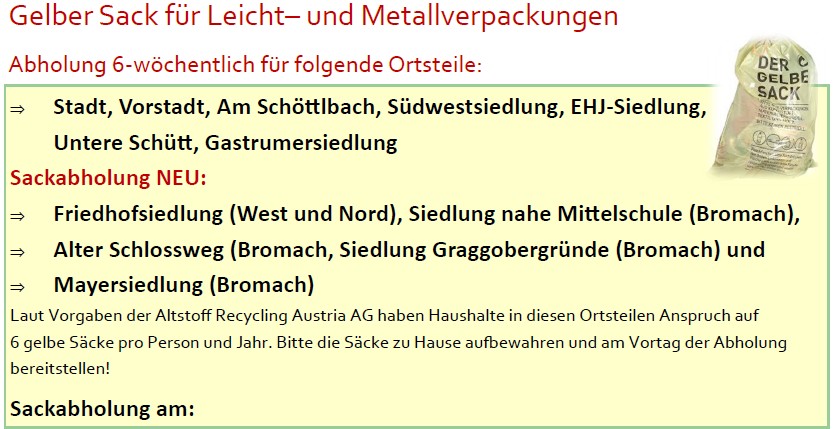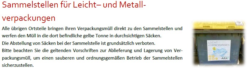 In der Steiermark werden sämtliche Leicht- und Metallverpackungen gemeinsam in der Gelben Tonne oder im Gelben Sack gesammelt. Gleichzeitig wird in ganz Österreich der Einwegpfand für Kunststoff-Getränkeflaschen und Getränkedosen eingeführt. Damit ist ganz Österreich auf eine einheitliche Sammlung umgestellt.